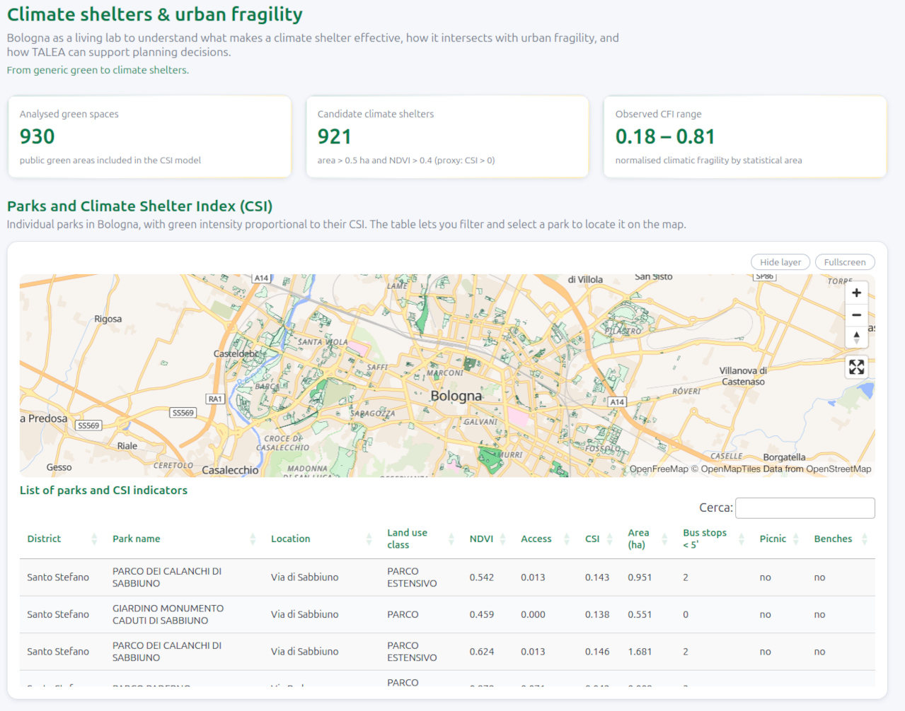The TALEA Platform hosts interactive maps, environmental indicators, urban heat island analyses, climate shelter data, and open-source code to replicate these tools in other cities. All resources are designed to support evidence-based climate adaptation.